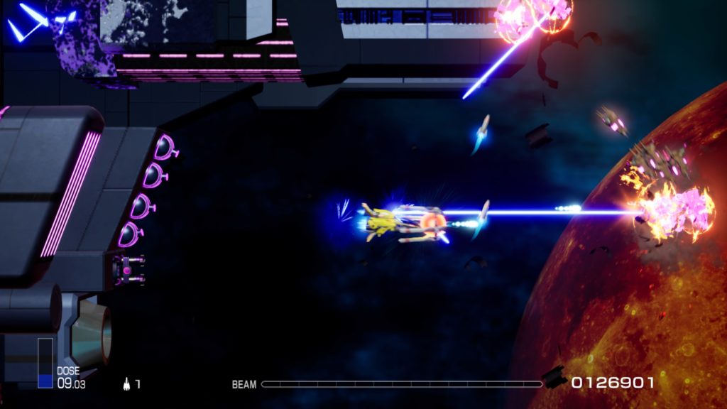Sachez toutefois que malgré la simplicité et la prise en main très abordable, le jeu ne laisse aucune chance, au moindre coup votre vaisseau explose ! La difficulté est tout simplement brutale, et les continues sont limitées ! Il faudra rester calme et y aller pas à pas avec les 5 niveaux de difficulté !