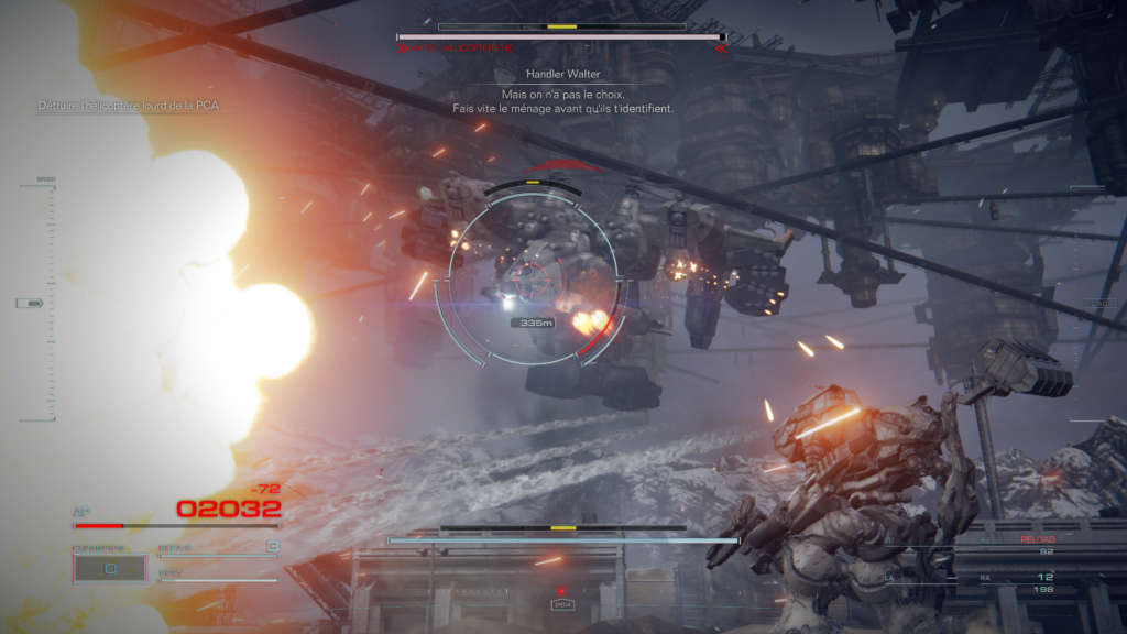 En effet, après chaque mission, on récupère de l’équipement et de l’argent pour pouvoir acheter d’autres pièces de remplacement sur votre mecha. Certaines armes peuvent attaquer l’ennemi avec des angles différents, ce qui peut être pratique en fonction de la configuration du blindage de l’ennemi. On peut ainsi changer adapter sa façon de jouer pour terrasser plus efficacement les boss par exemple. Une jauge de stunt a été ajoutée à cet opus, en attaquant, cette jauge se remplit et l’ennemi se désoriente un Instant, laissant ses défenses à plat pour que vous puissiez balancer la sauce et lui infliger des dégâts importants, si vous avez assez d’endurance, bien sûr !