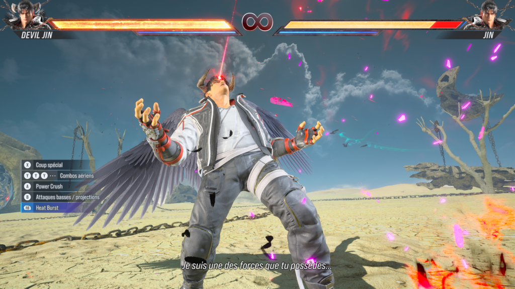 Avouons le directement, les derniers jeux de combats en date ont proposé des campagnes scénarisées à l’écriture qui faisaient la part belle aux différents lores et avec des mises en scènes cinématographiques abouties, je parle surtout de Mortal Kombat 1. Malgré son lore étoffé, la franchise Tekken n’a pas été très avare en qualité d’écriture scénaristique et ce huitième opus essaie un peu de différencier des précédents, en se vautrant. L’intrigue tourne autour de Jin Kazama qui doit faire face à Kazuya Mishima qui a tué son père et a soif de conquête et de chaos, voulant semer là guerre sur la planète. Un terrain scénaristique fertile à l’intervention de la vingtaine de combattants directement disponibles à la sortie du jeu !