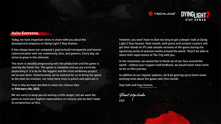 Techland annonce aujourd’hui que Dying Light 2 Stay Human sortira le 4 février 2022. Pawel Marchewka, CEO de Techland partage un message aux joueurs à propos de la nouvelle date de sortie et la décision de changer cette dernière.