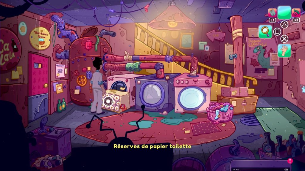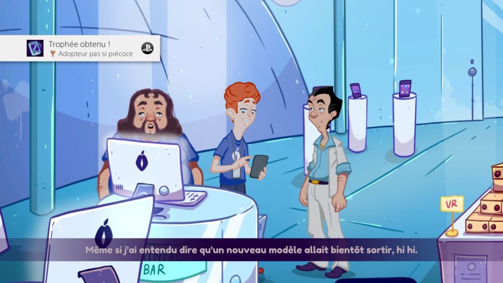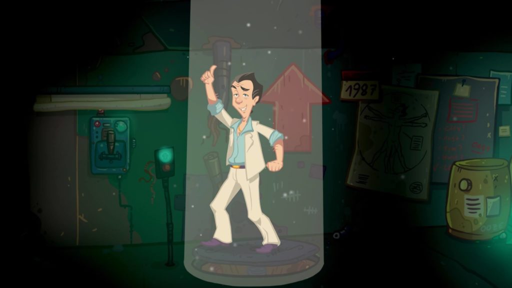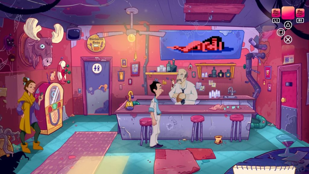 A peine sorti de ce mystérieux laboratoire, Larry doit savoir comment il est arrivé là, c’est à dire à cet endroit et surtout à cette époque ! Bien sûr, sa libido légendaire n’est pas assagie pour autant et Larry voudra d’emblée se taper les filles qu’il rencontre durant l’aventure. Une aventure bourrée d’humour gras, à l’orientation sexuelle et parfois scatophile, mais toujours borderline ! En 2019, ce genre de contenu est directement relayé au second plan, dans les sombres dédales de la prétendue misogynie, ou tout simplement une apologie à la beaufitude pour certains de nos confrères journalistes. De notre côté, l’idée qu’un dragueur des années 90 débarque dans le futur et est obligé de s’adapter à ce nouveau monde, mais aussi aux nouvelles technologies et comment les utiliser pour arriver à ses fins est plutôt marrant ! Certes, il n’y a que 8 heures de durée de vie et le nombre de tableaux à visiter est assez petit, mais les challenges sont plutôt coriaces ! Techniquement, rien de méchant à signaler, ça reste un point n click classique où il faudra résoudre des puzzles en combinant certains objets récupérés par-ci par-là. Console oblige, il n’est pas nécessaire de balader le curseur sur l’entièreté des tableaux pour réussir à voir les différentes choses à observer ou avec lesquelles interagir. En effet, il suffit d’appuyer sur les touches L2 et R2 pour faire défiler les différents éléments d’intérêts du décor !