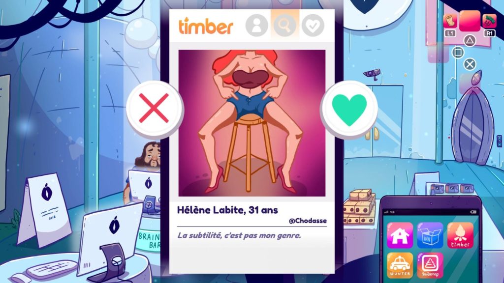 Après des années de disparition, Larry s’éveille dans un laboratoire sombre et sans aucun explication. Larry ne sait pas où il est, mais pire, il semble que Larry a carrément fait un bond dans le temps ! Véritable clin d’œil au fait que la licence date de la fin des années 80, notre héro à la libido en feu découvre les nouvelles technologies et notamment les applications de rencontre et leur fonctionnement. Le jeu reprend toutes les tendances et les arrange à sa sauce, la pomme d’Apple remplacée par une prune très suggestive ou encore l’utilisation d’applications de rencontres comme Timber, mais aussi Umber et autres joyeusetés qui déroutent pas mal notre voyageur du temps ! Avant de se lancer dans l’aventure, le jeu vous propose quelques questions pour voir si vous êtes bien majeure, notamment avec des questions orientés pop-culture ou des choses typiques des années 90 ! Ces questions donnent déjà un avant-goût de l’esprit décalé du jeu, on adore !
