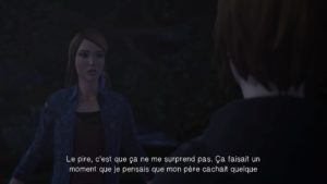 Pour terminer sur une excellente note, sachez que la bande son fait honneur à la série Life is Strange en proposant des morceaux d’indie rock très plaisants pour les amateurs et qui cadre bien avec l’ambiance du jeu et par rapport à la personnalité de Chloé (clichés quand tu nous tiens). Mention spéciale à la musique du menu du jeu, une pure merveille en matière de post-rock instrumental. Les doublages sont de manière générale de bonne facture, sans pour autant s’avérer exceptionnels avec parfois des pertes de rythme dans la qualité de jeu des doubleurs. Petit bémol malgré tout, quand il n’y a pas de musique ou de doublage, tout semble vide en matière de sons. Ça inspire à la contemplation me direz vous ! Et bien, il aurait semblé approprié d’ajouter quelques fields recordings à la bande sonore pour immerger un peu plus les joueurs dans une ambiance qui n’arrive que de peu à égaliser l’univers que nous avions découvert dans Life is Strange. Pour terminer, parlons du dernier point fâcheux, la traduction ! En effet, celles-ci s’avère assez bâclée et fera sans doute grimacer les anglophones, notamment en ce qui concerne certaines expressions anglaises qui perdent de leur sens une fois traduites car elles ne restent pas dans le contexte ou la situation.