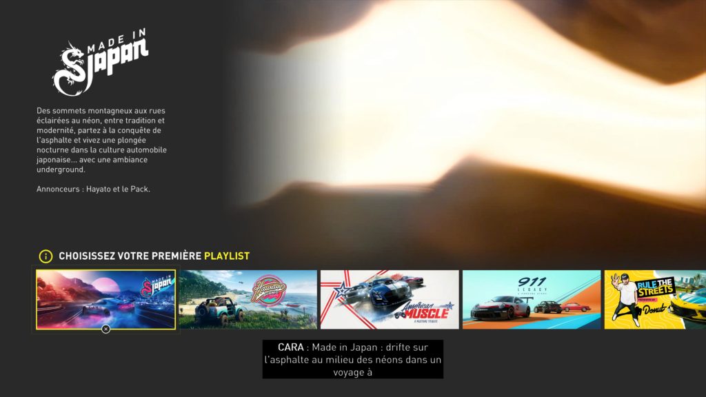 Le jeu n’a pas vraiment d’histoire, mais plutôt 15 playlists de courses qui se distinguent par les types de véhicules utilisés et des épreuves proposées : muscle cars, drift, voitures tunées, sports cars, F1, 4×4 et bien d’autres ! Il y en a vraiment pour tous les goûts et ces playlists embarquent des cinématiques en prise de vues réelles qui présentent parfois des personnalités connues du monde automobile. Ça ajoute quelque chose au niveau visuel, car on a pas seulement des vidéos en images de synthèses ou avec le moteur du jeu. Un moteur graphique qui propose du 60 FPS, mais qui n’empêche pas des chutes de framerate qui seront sans doute corrigées avec des patches et qui n’entachent pas trop le plaisir de jeu !