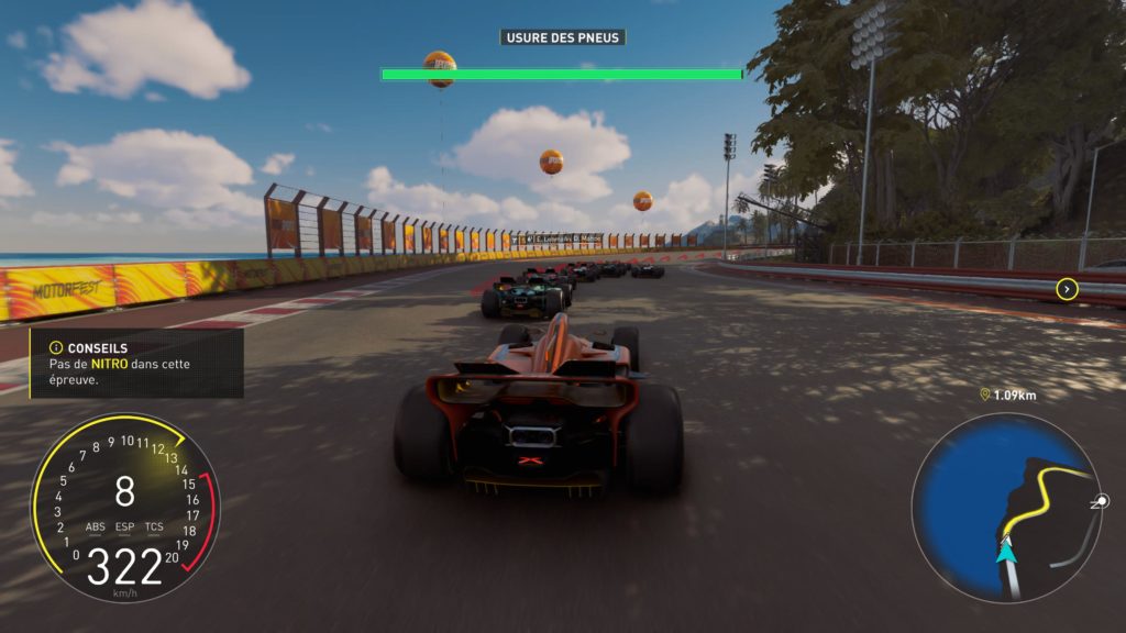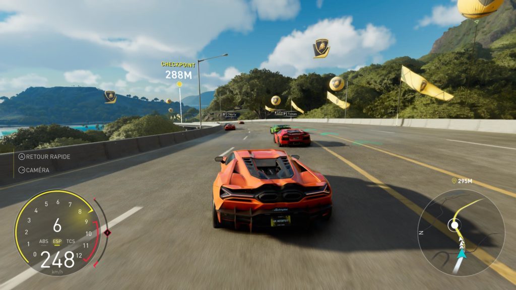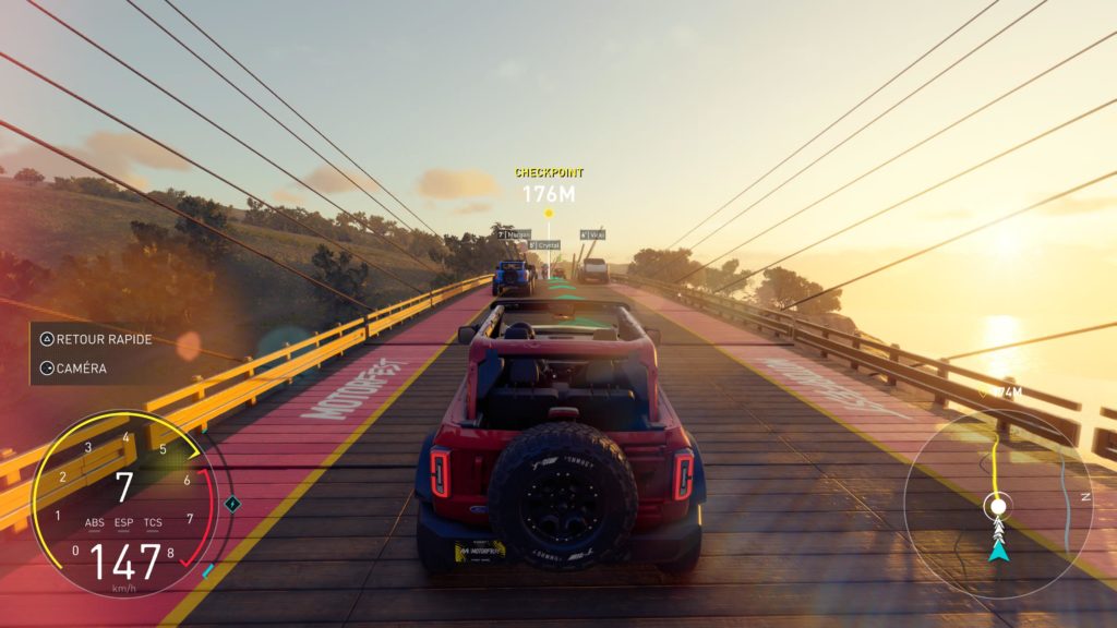En termes de bande-son, le jeu ne propose malheureusement toujours pas de radios à proprement dites, on a juste la voix d’une IA qui nous tiens compagnie, ainsi que le doublage francophone des différents protagonistes du jeu. Malheureusement ces derniers manquent de conviction, c’est assez plat et oubliable. Les musiques sont passables, peut être un peu trop commerciales, j’ai eu du mal à être transporté par les tracks électro » pouet pouet ». Ce qui a clairement impressionné et m’a fait oublié les défauts sonores cités précédemment, c’est le sound design de ce The Crew Motorfest ! Un travail colossal a été effectué sur les différents bruitages quand on change de vitesse, frôle des voitures, dérape, les graviers, les ronrons du moteurs… le tout sortant des hauts parleurs de la Dualsense ! Je vous avoue que je coupe souvent les sons qui émanent de la manette sur la plupart du jeu, mais ici c’est clairement tellement bien foutu que cela ajoute un énorme plus dans l’immersion des courses !