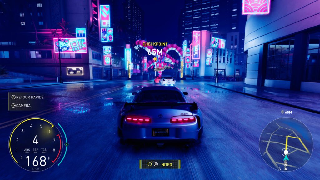 Des véhicules que l’on peut acheter avec l‘argent engrangé par les courses victorieuses et customisables avec les différentes pièces d’équipements qui permettent autant des améliorations en termes de performances que de style de jeu. Qu’on se le dise, malgré l’étiquette arcade assumée du jeu, il est possible de rendre la conduite un peu moins mâchée en réduisant les aides à la conduite. Cerise sur le gâteau, les vibrations et retours haptiques de la Dualsense de la Playstation 5 ont été énormément travaillés et ajoutent encore plus de sensations à la conduite, c’est une vraie réussite à ce niveau quand on sent les resistances sur les gâchetes et les effets de vibrations peaufinées en fonction du terrain, de la courbe etc !
