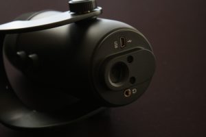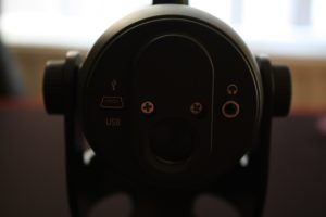 Penchons nous sur les différents interrupteurs et entrées disponibles. Outre l’entrée mini USB sous le micro, il est possible de brancher un casque audio via l’entrée casque qui se trouve juste en avant de l’entre USB. Vous pourrez régler le volume du casque sur le bouton central qui se trouve sur la face avant du micro. Le bouton mute se trouve juste en dessous de ce dernier et permet à tout moment d’arrêter le micro ! La position de ces deux derniers boutons est judicieuse et offre une utilisation facile.